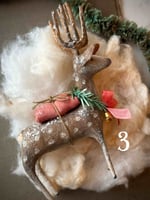 These charming, antique-inspired reindeer are entirely made using the Old World art of spun cotton. Each one is created by wrapping cotton around a wire armature, stiffening it with glue wash, painting, and intentionally aging for a timeworn effect. All reindeer are finished with a light frosting of mica glitter, a hand-dyed bottle brush wreath and ribbon, a vintage brass bell, and some are adorned with packages.