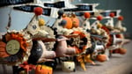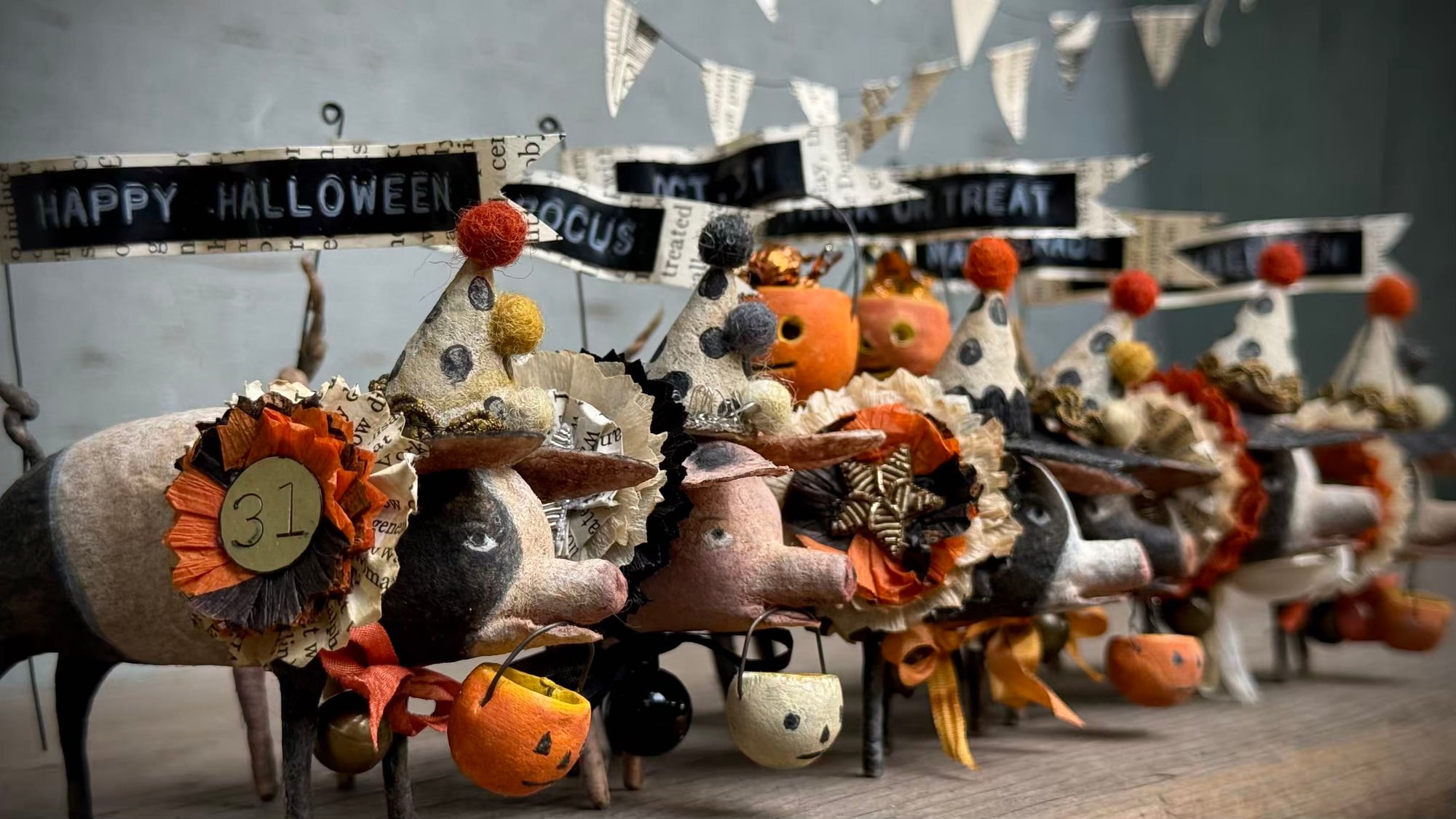 These Halloween-decorated, antique-inspired pigs are entirely handmade using the Old World art of spun cotton. Each one is created by wrapping cotton around a wire armature, stiffening it with glue wash, painting, and intentionally aging for a timeworn effect. Each pig is finished with various Halloween decorations, such as jack-o-lanterns, banners, and rosettes. (All pig embellishments are removable.)