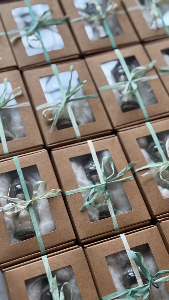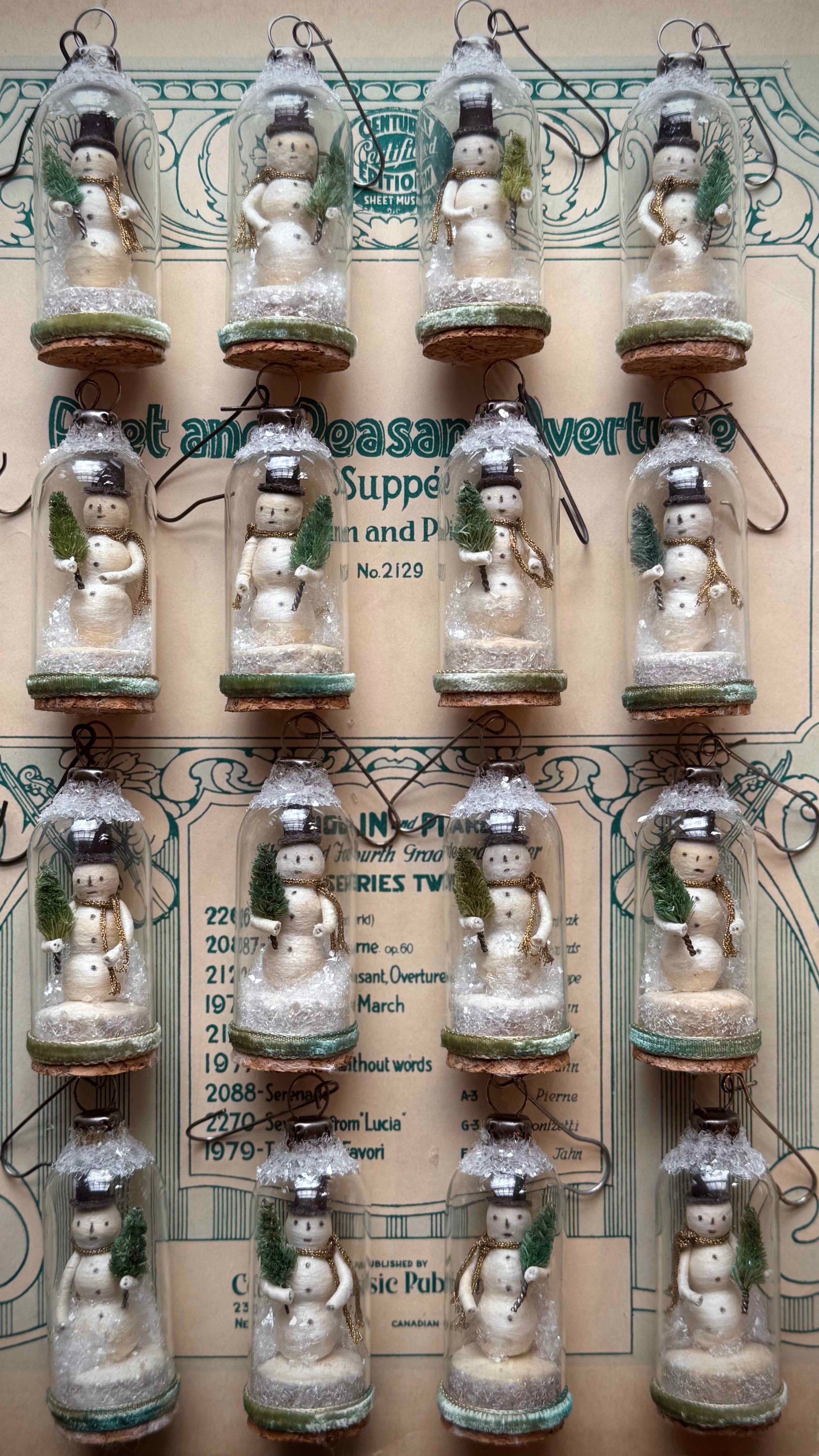 Your curated supplies kit includes the materials needed to make three snowman snow globes, using the same techniques and materials I use in my own studio.