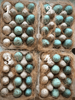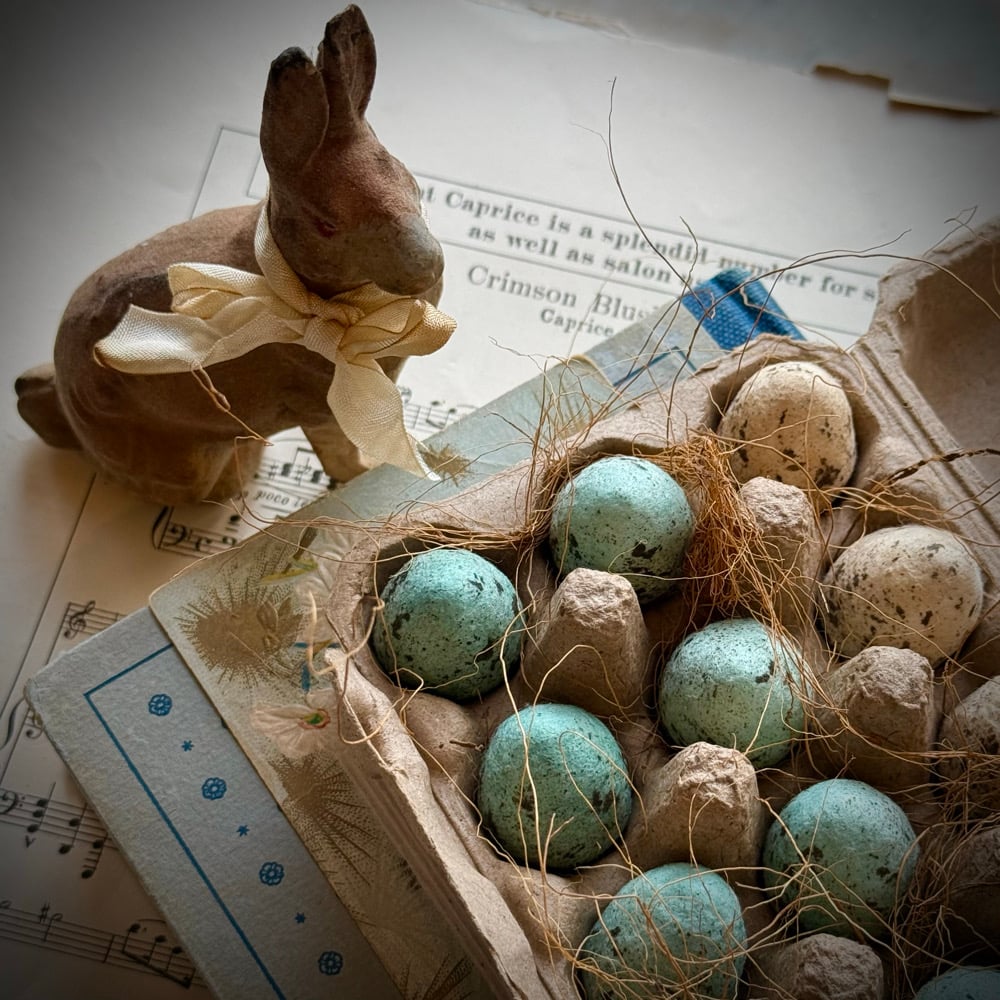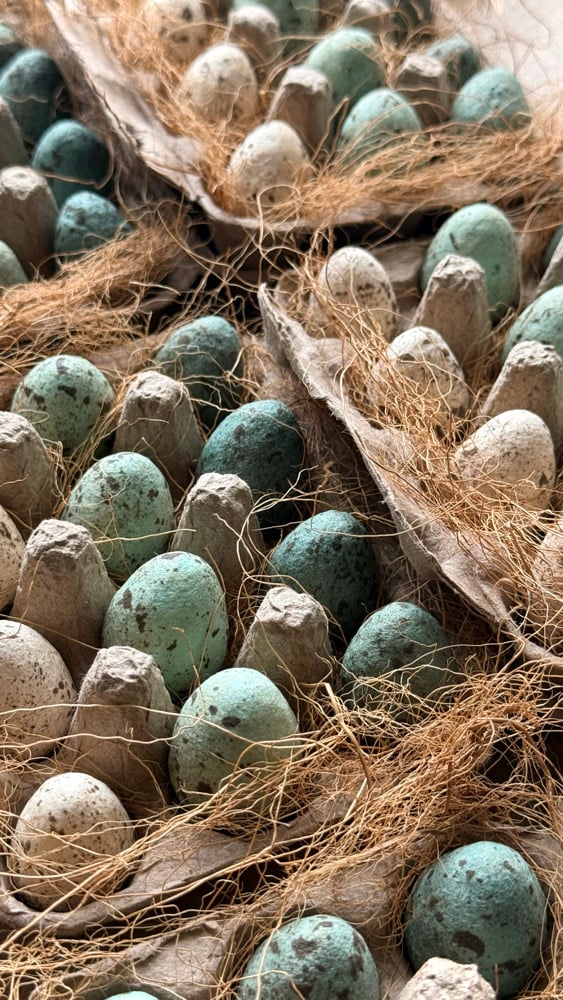 These naturalistic eggs are covered in hand-dyed cotton, and painted to resemble real eggs found in nature. The eggs come packaged in a quail egg carton, adorned with a vintage postcard image. The eggs are quail egg size, about 30 mm and are very lightweight due to being made of cotton.