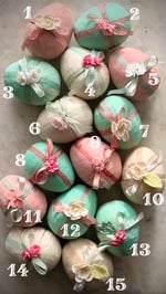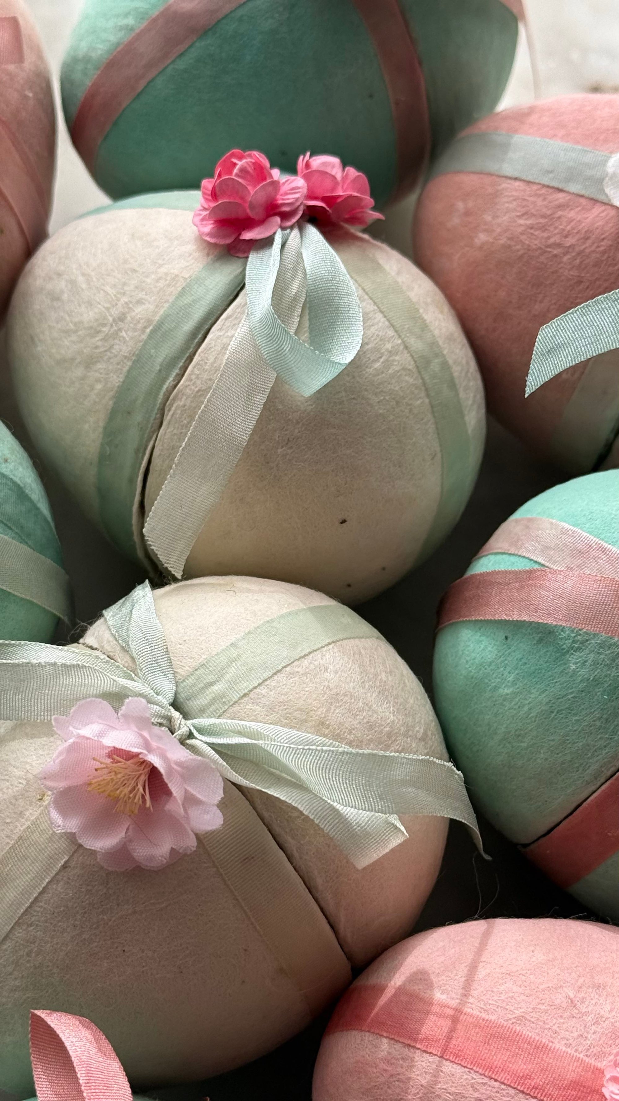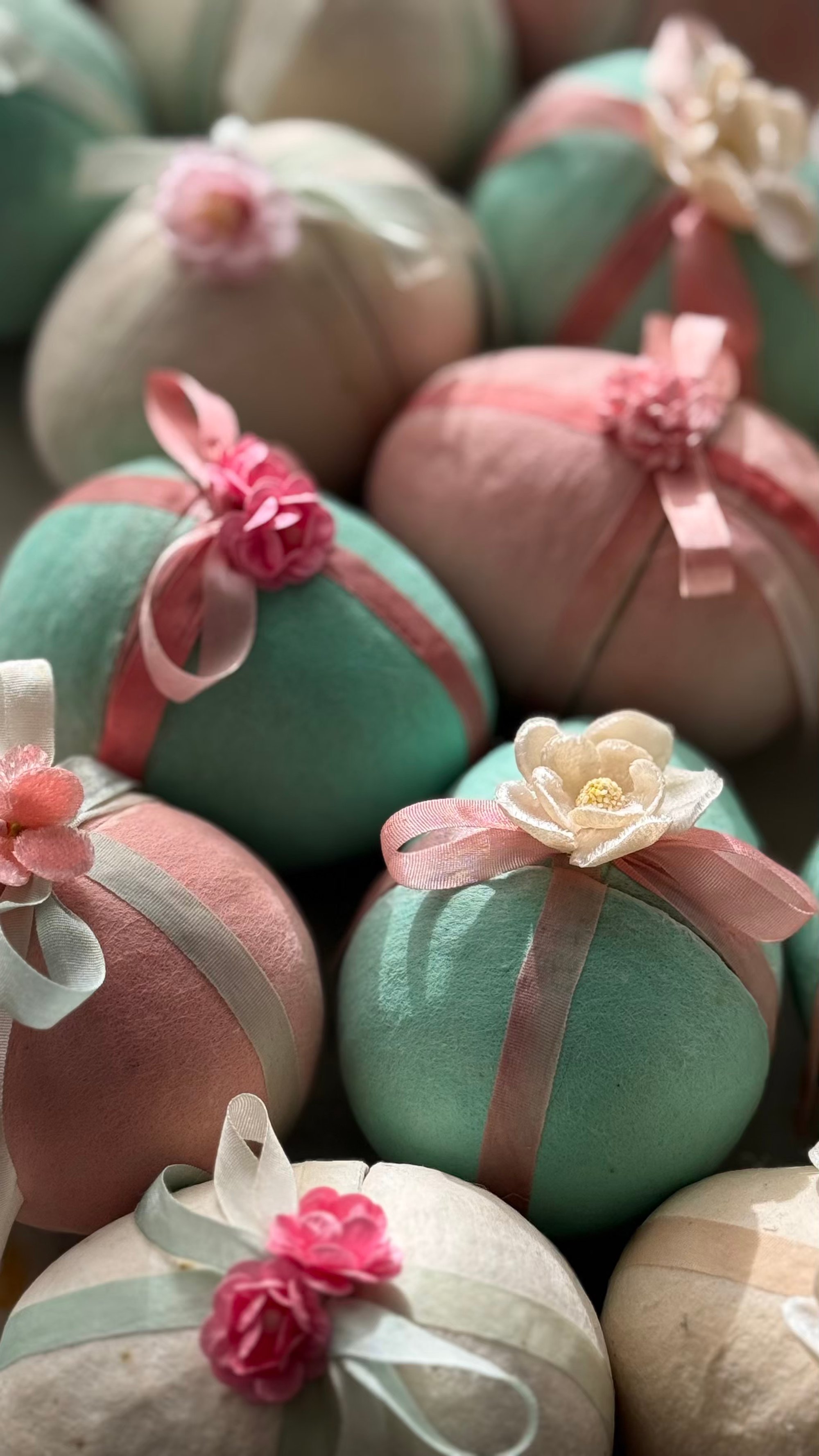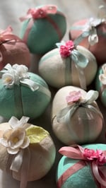 These Victorian Inspired Easter Eggs are 3” tall covered with cotton for a warm, vintage-toned surface, and detailed with hand-dyed silk ribbon and delicate floral embellishments. Each egg is openable, and thoughtfully designed so the ribbon and flowers remain in place when opened—revealing a charming golden interior for candy or other treasures.